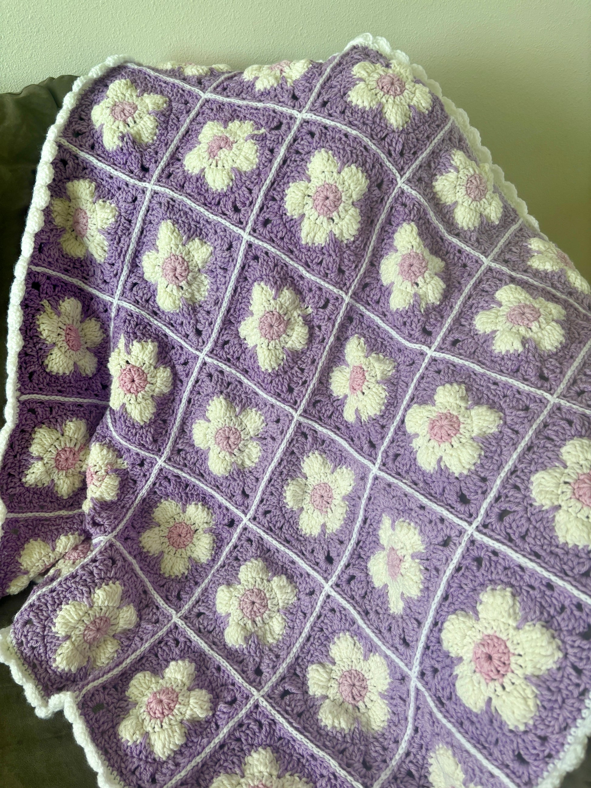 Wrap yourself (or someone you love) in cozy charm with this handmade crochet blanket, crafted with car. Each square features a sweet daisy-like flower with a blush pink center and soft cream petals, set against a lovely lavender background. The entire piece is joined in white and finished with a delicate scalloped border for a polished, vintage-inspired look.