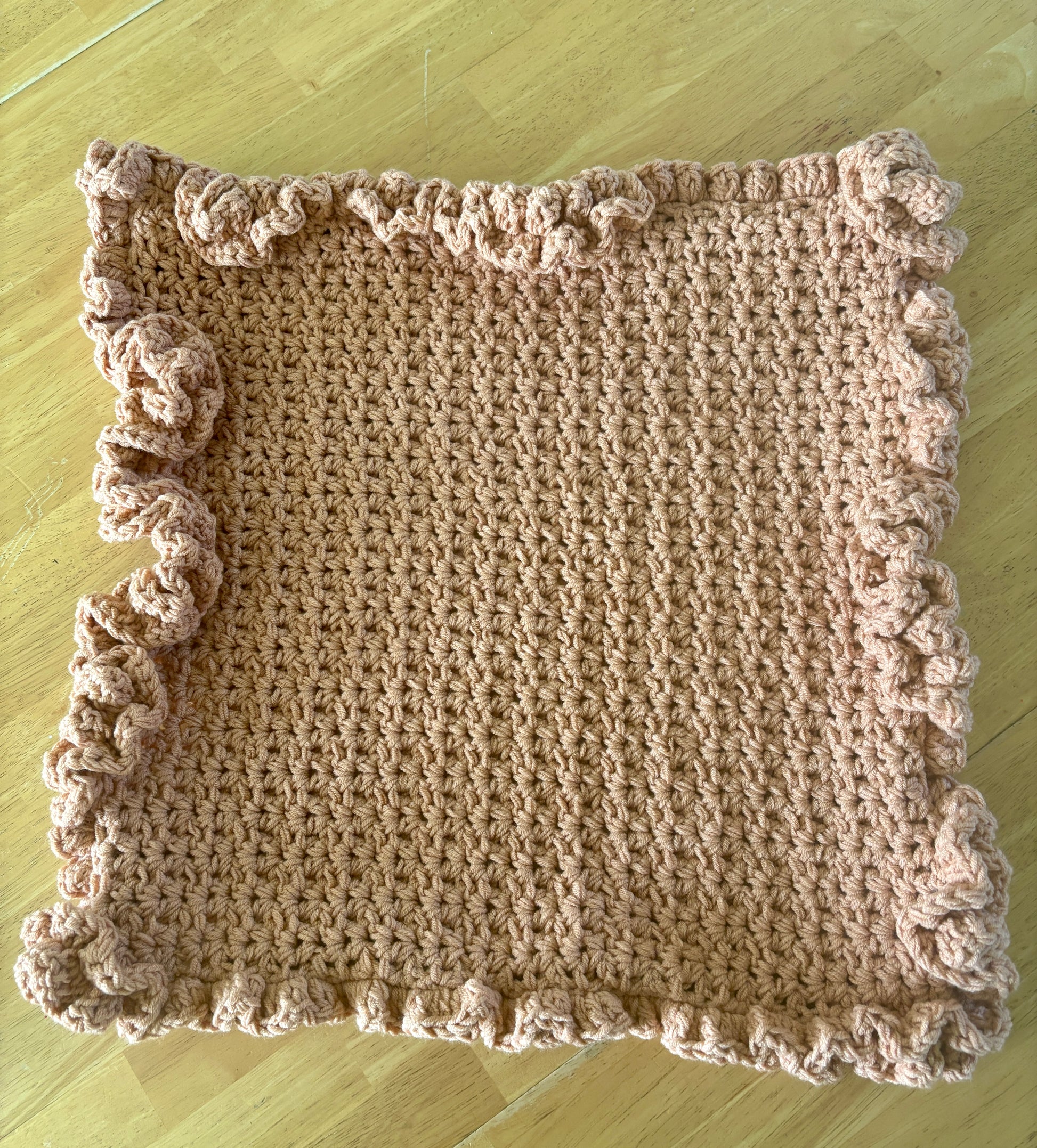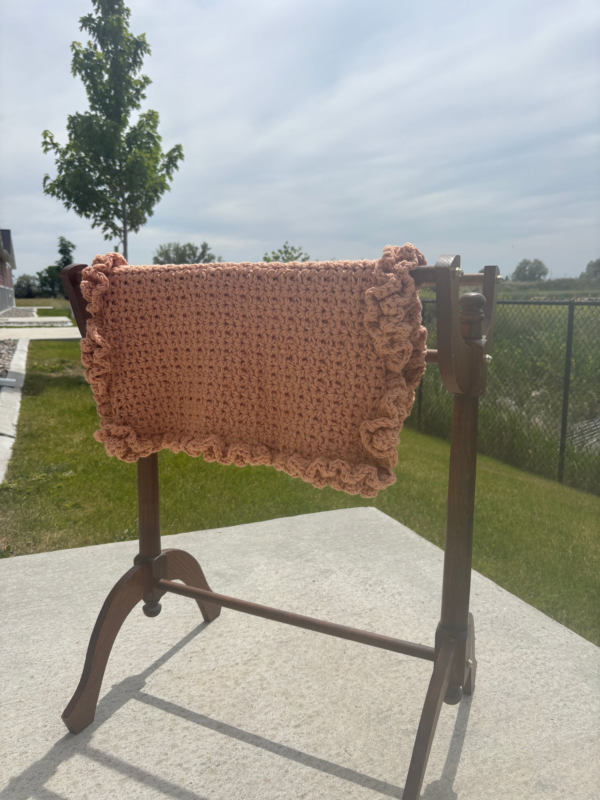 This crocheted lovey is a sweet and soothing comfort item, perfect for snuggles. Made with soft acrylic yarn in a neutral pink and double stranded for added thickness and warmth. It measures approximately 18.5”x18.5” - just the right size for little hands. Finished with a delicate double ruffle border for an extra touch of charm.